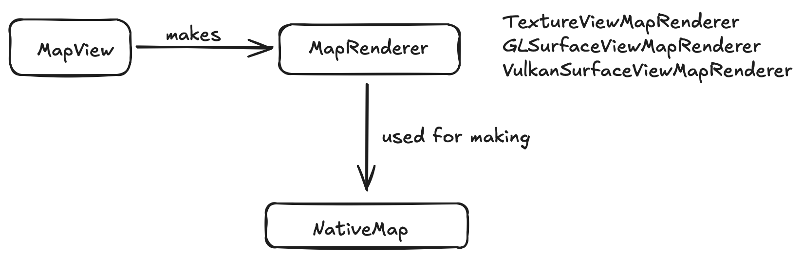 So how does the map get rendered? A NativeMapView requires a MapRenderer parameter that does the actual rendering. This renderer class has methods for when a surface is created, changed, or destroyed. There are three primary renderers on Android today - TextureViewMapRenderer (used by the original solution), and GLSurfaceViewMapRenderer (used by default today). The third is VulkanSurfaceViewMapRenderer (which, along with GLSurfaceViewMapRenderer, inherit from a shared SurfaceViewMapRenderer).