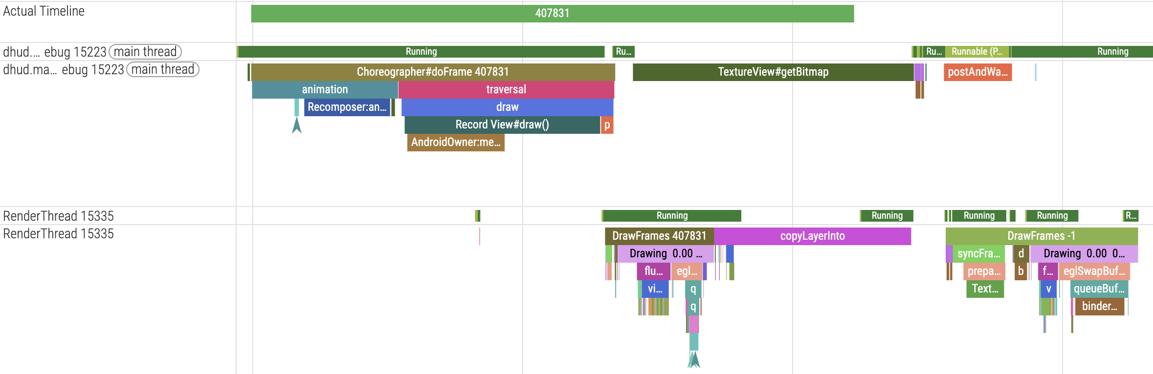 Every frame ends up drawing twice - first to the off screen map, and then via TextureView#getBitmap and the corresponding copyLayerInto, to Android Auto itself. If we estimate our “acceptable frames” as (None + Buffer Stuffing) / Total, we get ~62.9% successful frames across a 15 second window. We are able to get 124 frames rendered within this 15 second window, which is ~8.26 frames per second.